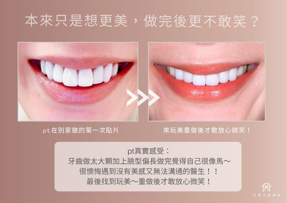 影片中展示了前後對比照片,清楚呈現了前一家診所與玩美牙醫作品的顯著差異。