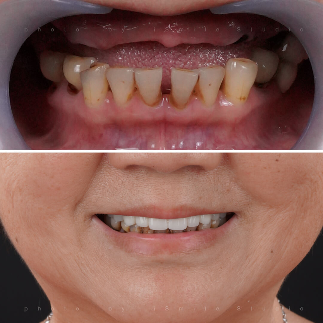 1.在其他診所失敗的植牙:造成植體歪斜根本無法承受牙齒的咬力,也導致牙床骨萎縮牙齦上縮的問題,玩美植牙專業團隊,先將錯位的植體取出,運用3D斷層輔助,將萎縮的牙床填海造路,豐隆恢復健康的牙床後再精準植牙,修復豐填回覆健康牙齦的美感術式,還給蘇小姐微笑的自信。